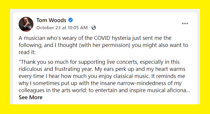 But in the meantime, my frustration needed an outlet. I emailed Harvard historian and libertarian podcaster Tom Woods, of whose show I’ve been a devoted fan since 2016, with a brief account of the experience. I was fed up with the lockdowns’ effect on our industry, but also grateful for Dr. Woods’ support. (He often mentions on his show that he attends symphony concerts, operas, and ballets.) I knew I wouldn’t hear back; it just felt good to get it off my chest.